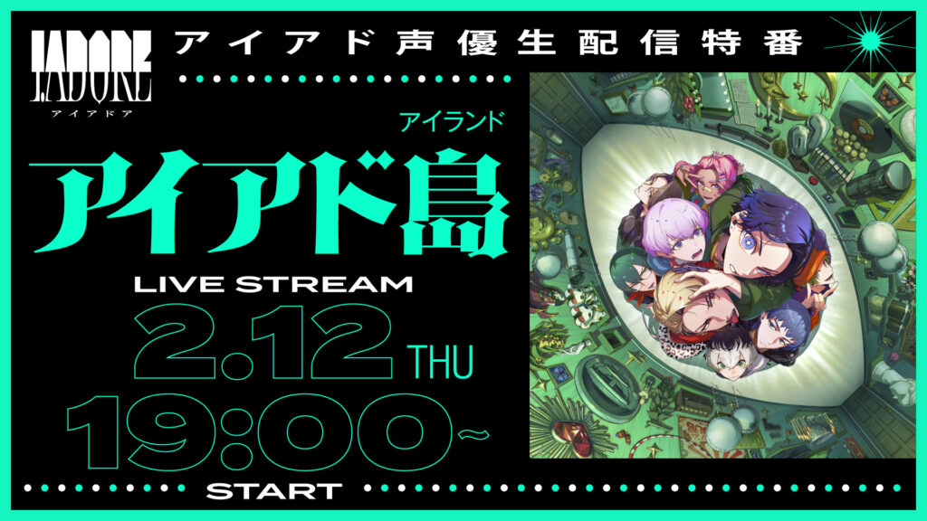 さらに、2月12日(木)19時より、『I.ADORE』プロジェクトの始動と「IDOLIZE」の配信を記念したアイアド声優全員出演のYouTube特番「アイアド島(ヨミ:アイアド アイランド)」の生配信が決定しました!『I.ADORE』プロジェクトが始動して以来、キャスト全員の姿を見ることができる初の機会となりますのででお見逃しなく。