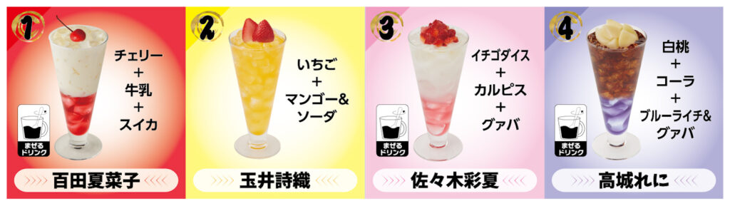 また、ももクロメンバーをイメージした4種【各750円(税込)】のコラボドリンクが販売されます。