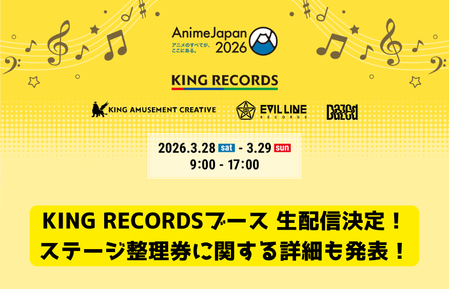 2026年3月28日(土)・29日(日)に東京ビッグサイトで実施される世界最大級のアニメイベント「AnimeJapan 2026」のキングレコードブースのステージ観覧整理券に関する詳細が発表に!さらに当日キングレコードのオフィシャルYouTubeチャンネルにて生配信されることも決定しました!