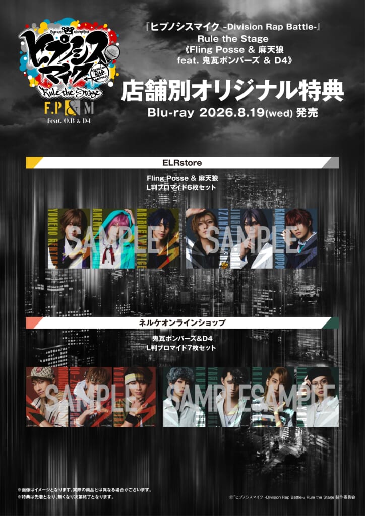 ELR Storeの特典では、Fling Posse & 麻天狼 L判ブロマイド6枚セットを、ネルケオンラインショップの特典では、鬼瓦ボンバーズ&D4 L判ブロマイド7枚セットを手に入れることができます。