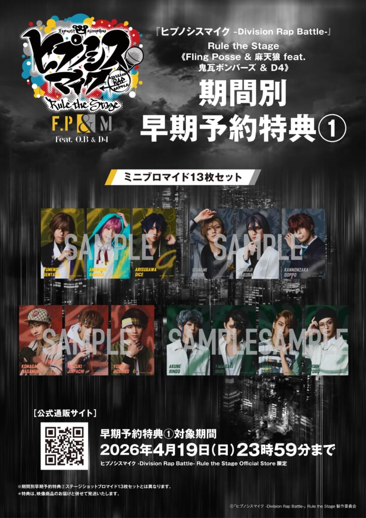 あわせて、HYPNOSISMIC Rule the Stage Official Storeでの公演期間中限定の第一弾早期予約特典として、ミニブロマイド13枚セットが、第二弾早期予約特典として、ステージショットブロマイド13枚セットが特典となることも決定しました!