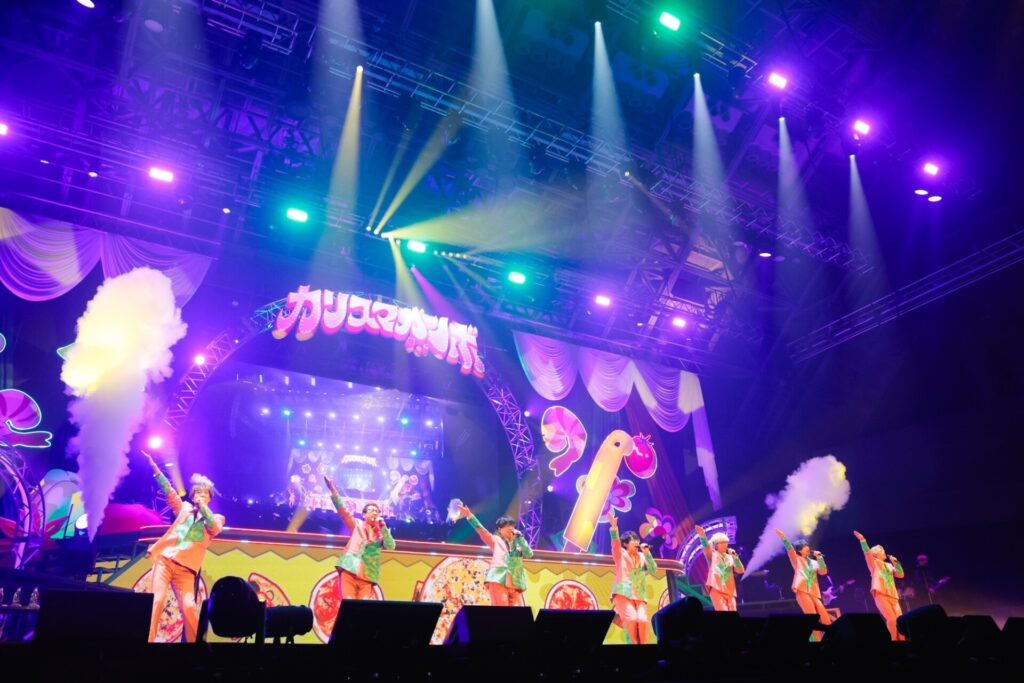 そして、『おつカリスマ!忘年会』、『カリスマジャンボリー』を、凡人ダンサーズを交えて賑やかにパフォーマンス。最後のあいさつでは、小野が「カリスマっていいな。この一言に尽きます。だから……別れたくねえなぁ(笑)。この景色をまたいつか見られるといいな」と名残惜しそうに感謝を伝え、ラストスパートへ。『超カリスマ凡踊り』では、凡人も一緒になって少しだけ時期外れの盆踊りに興じ、『めちゃめちゃカリスマ』のソロパートでもあらためて最後のあいさつ。七人全員が鍋の中に入ったところで、無事、ガンボ完食となった。