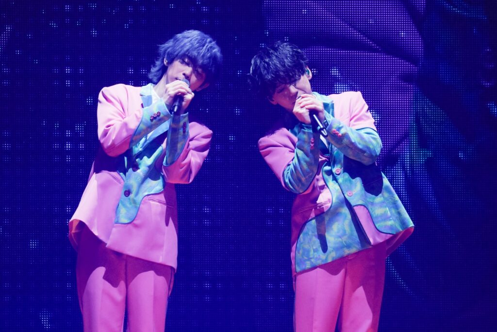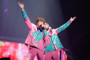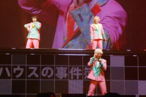 そして「カリスマガンボツアーは?」「サイコー!!」という特大コーレスを経て『FUJIYAMA CHARISMA』を歌唱。その後は、『ビックカメラのテーマソング』(※『カリスマガンボ』にはボーナストラックとして『カリスマver.』を収録)を曲振りにして、ユニット曲の歌唱ブロックへ移行。『ねんねむりんりん』(本橋依央利&湊大瀬)、『ほわシャパ☆カリスマス』(猿川慧&天堂天彦)、『カリスマハウスの事件簿~消えた秩序の笛~』(伊藤ふみや&草薙理解&テラ)が順に披露された。