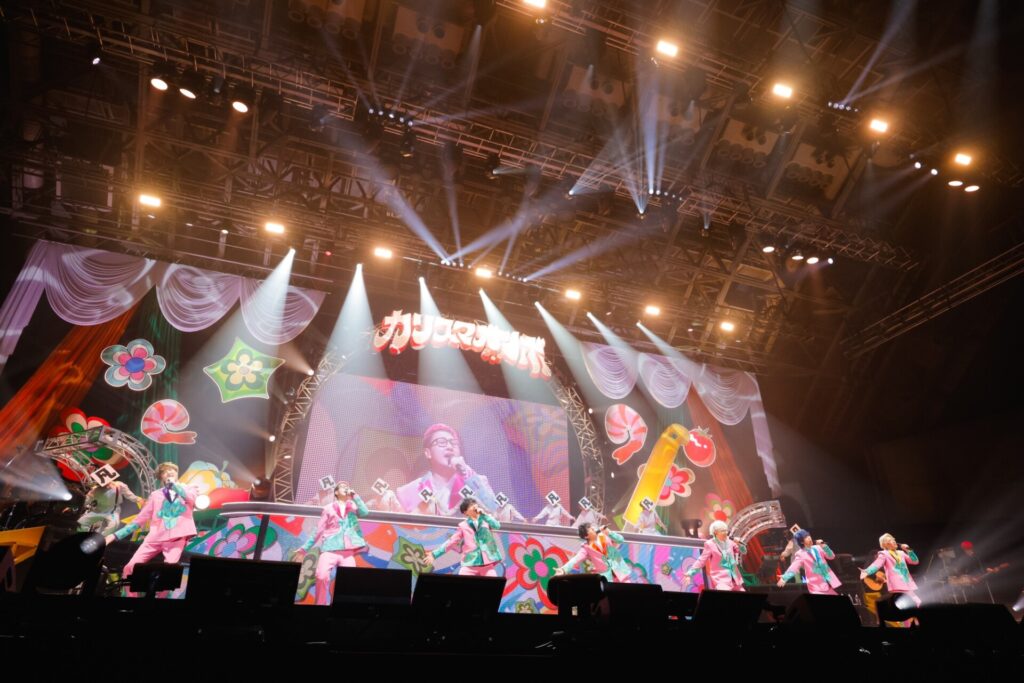 そして、『おつカリスマ!忘年会』、『カリスマジャンボリー』を、凡人ダンサーズを交えて賑やかにパフォーマンス。最後のあいさつでは、小野が「カリスマっていいな。この一言に尽きます。だから……別れたくねえなぁ(笑)。この景色をまたいつか見られるといいな」と名残惜しそうに感謝を伝え、ラストスパートへ。『超カリスマ凡踊り』では、凡人も一緒になって少しだけ時期外れの盆踊りに興じ、『めちゃめちゃカリスマ』のソロパートでもあらためて最後のあいさつ。七人全員が鍋の中に入ったところで、無事、ガンボ完食となった。